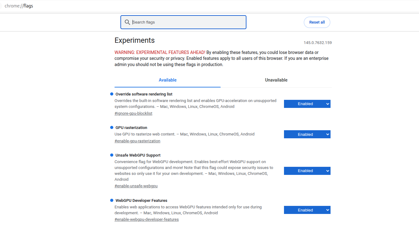 To ensure optimal performance and compatibility on Linux, verify your chrome://flags settings. Below is a reference for the recommended GPU and Dawn API configuration: