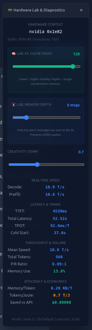- Diagnostic Panel: displaying a number of metrics and settings e.g. variabke KV pages, memory depth, temperature, token decode and prefil, TTFT, total latency, TPOT, cold start time, mean speed, total tokens, P:R Ratio, Memory Use, Memory/Token, Tokens/Joule, Saved vs API estimate.