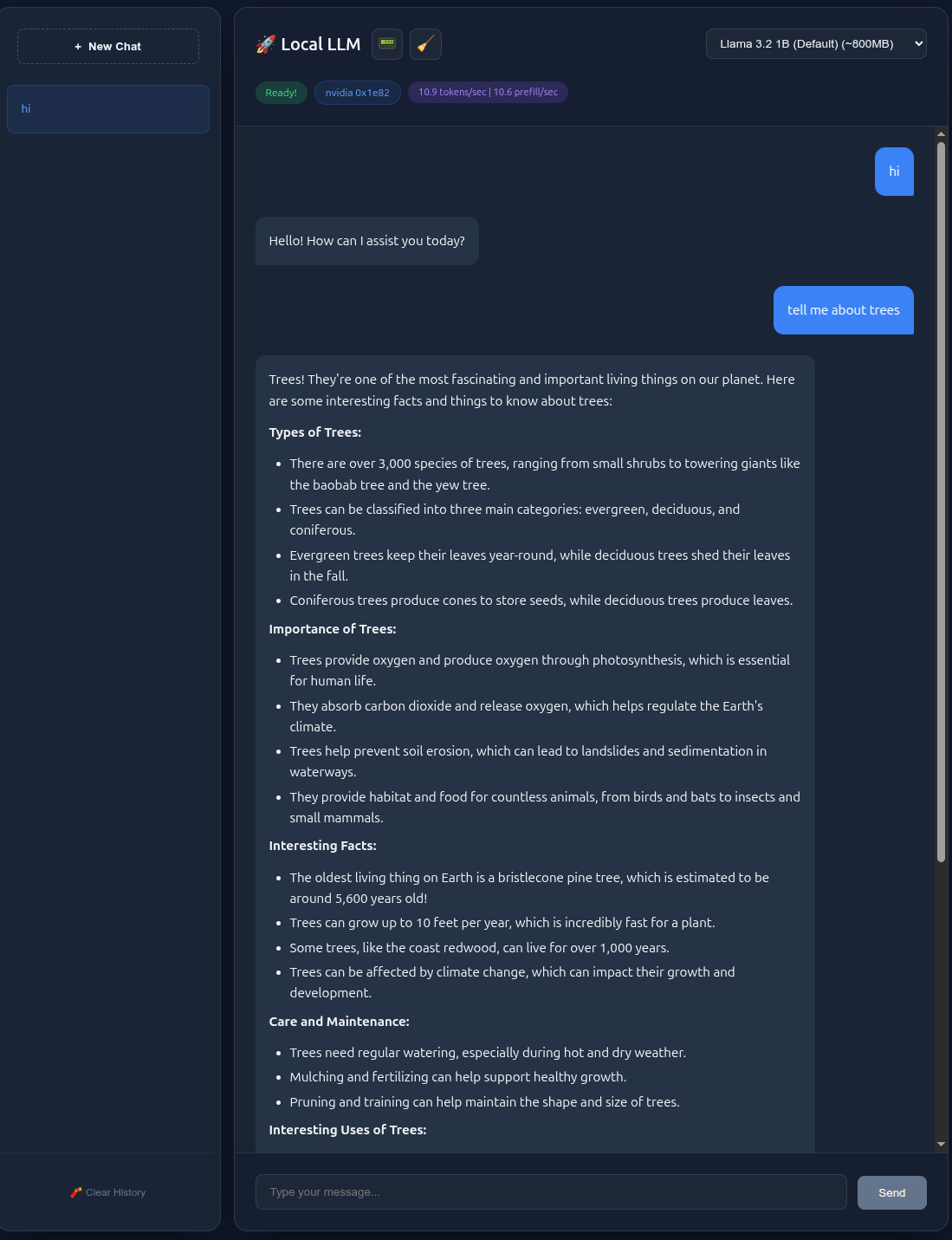 A high-performance, private, and entirely local Large Language Model (LLM) chat application running directly in the browser using WebGPU and WebAssembly.